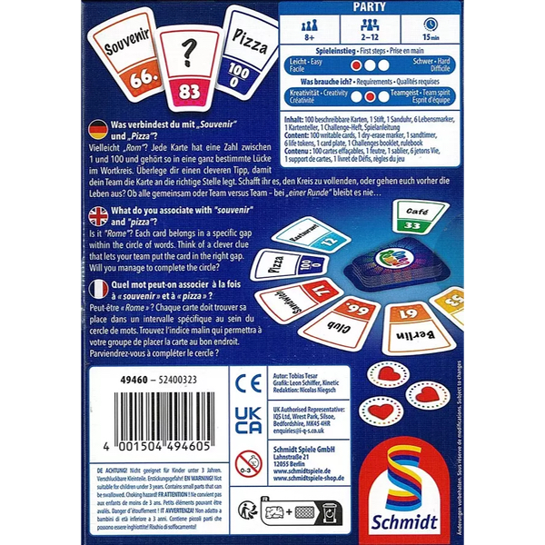 Dans One Round ?, chaque carte doit trouver sa place dans un intervalle précis au sein du cercle de mots. Trouvez l’indice malin qui guidera votre équipe et placez la carte au bon endroit. Pour gagner, il vous faudra positionner 12 cartes avec justesse.