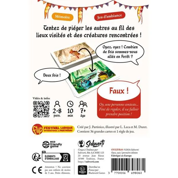 Oyez, Oyez ! est un jeu très grand public aux règles simples, qui renouvelle le jeu de mémoire en jeu d'ambiance avec interaction.