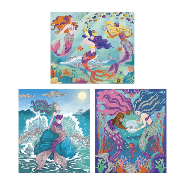 Ce kit créatif permet de décorer 3 tableaux sur le thème des sirènes à l’aide de zones autocollantes à recouvrir de paillettes biodégradables.
