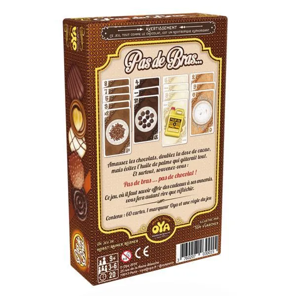 Pour chaque sorte, il faudra récupérer le tas de cacao, mais éviter l’huile de palme qui donne un sale goût au chocolat et surtout ne pas récupérer la carte pas de bras, parce que : Pas de bras… pas de chocolat !