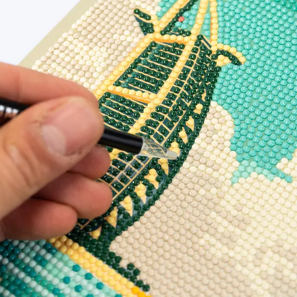 La toile sur laquelle les gemmes sont appliquées est soutenue par une tablette rigide pour permettre une adhérence parfaite des gemmes.