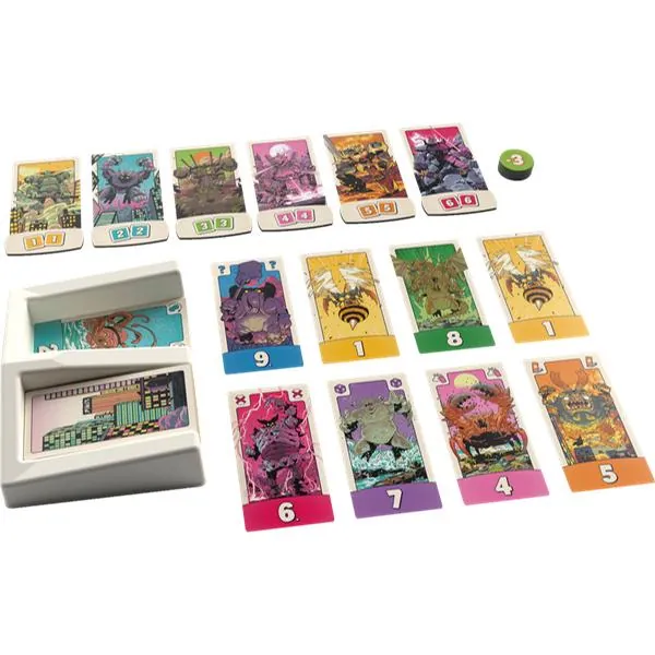Ensuite, faites l’acquisition de nouvelles cartes selon les résultats obtenus aux dés : carte de même valeur que chaque dé, que leur total ou que leur différence. Vous avez un double ! L’occasion de récupérer l’un des puissants Mecha ou de tenter de le voler à vos adversaires.