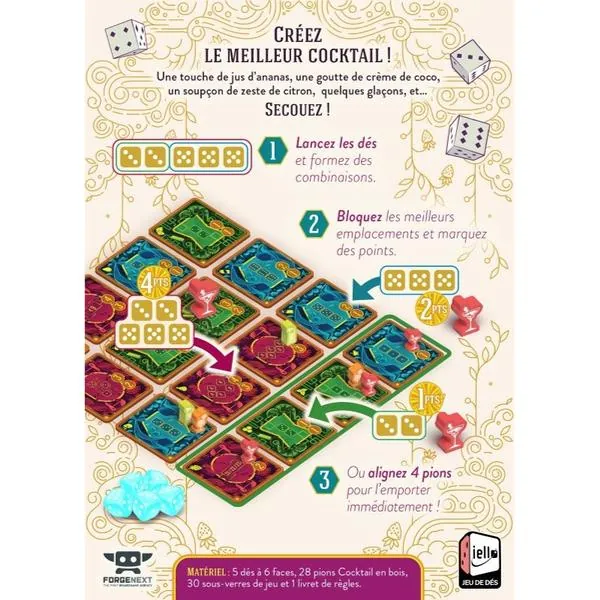 Piña Coladice s'impose en mélangeant habilement stratégie, hasard, et convivialité. Parfait pour animer vos soirées ! Préparez-vous à lancer les dés, à concocter des stratégies gagnantes, et peut-être même à célébrer votre propre Piña Coladice !