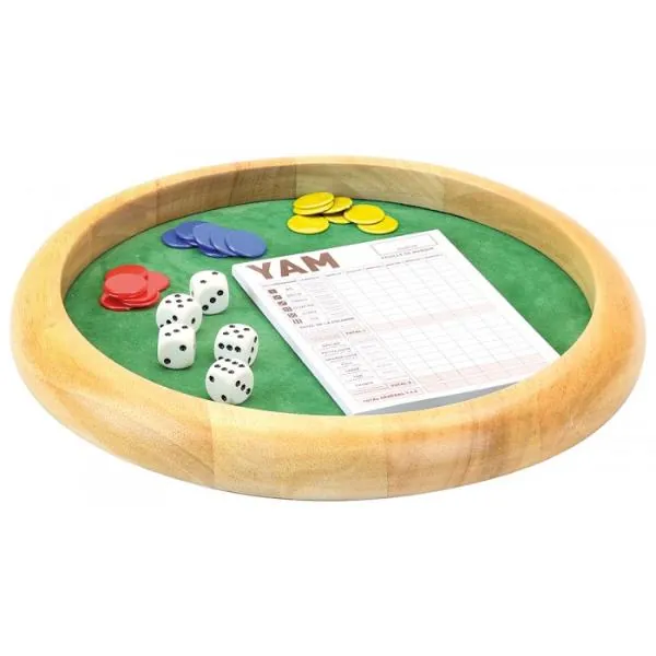 Piste de dés en bois avec 5 dés, 21 jetons et 1 bloc de Yam pour marquer les points - règles des jeux.