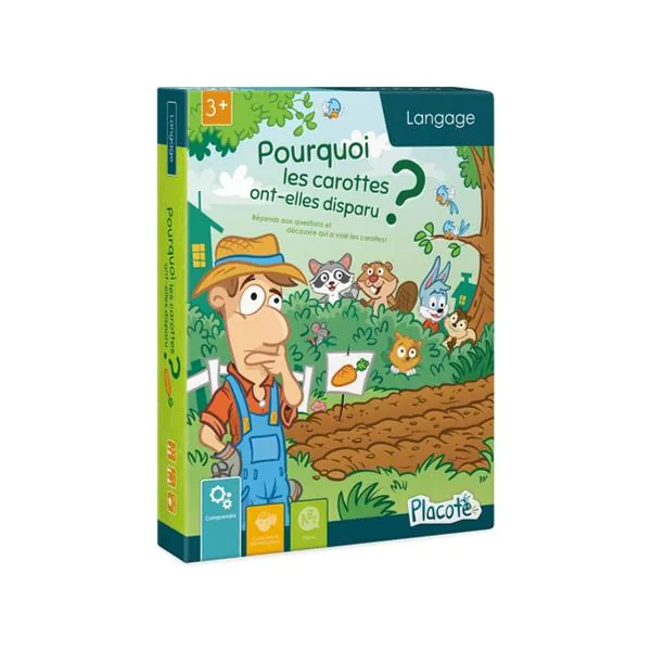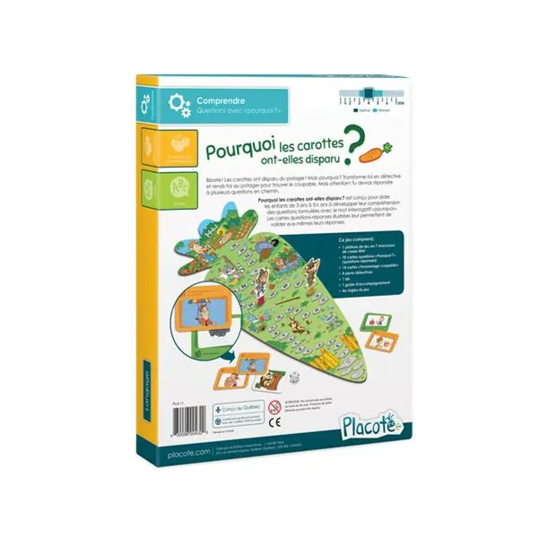 Pourquoi les carottes ont-elles disparu ? est conçu pour aider les enfants de 3 ans à 5½ ans à développer leur compréhension des questions formulées avec le mot interrogatif «pourquoi». Les cartes questions-réponses illustrées leur permettent de valider eux-mêmes leurs réponses.