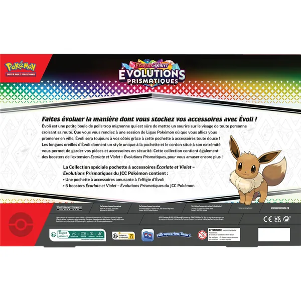 Les longues oreilles d’Évoli donnent un style unique à la pochette et le cordon situé à son extrémité vous permet de garder vos pièces et accessoires en sécurité. Cette collection contient également des boosters de l’extension Écarlate et Violet – Évolutions Prismatiques, pour vous amuser encore plus !