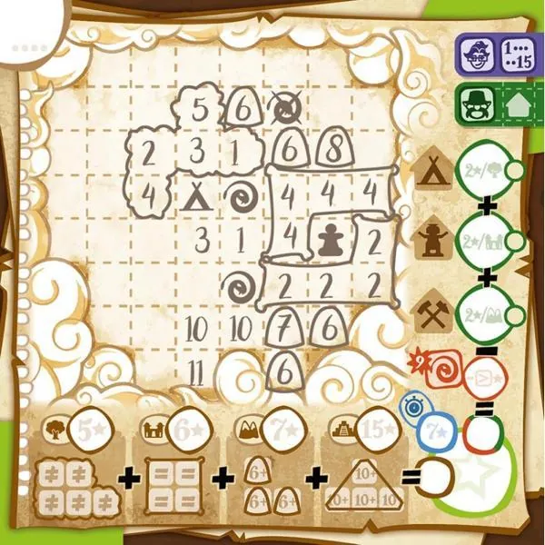 Dans la Vallée de Wiraqocha, placez vos résultats entre forest et montagne pour découvrir les ruines d' anciennes civilisations, mais attention aux serpents que les autres joueurs ne manqueront pas de gribouiller sur votre feuille.