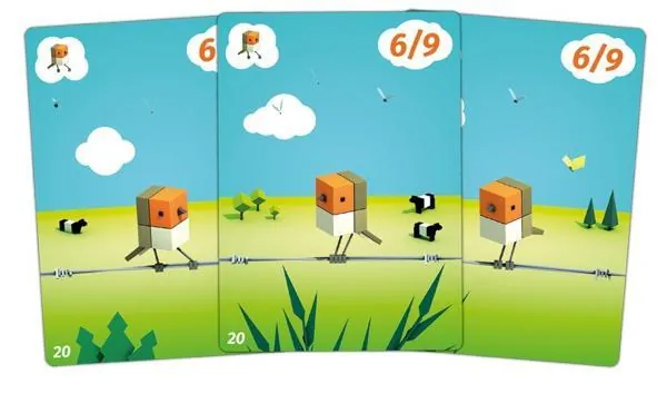Les joueurs commencent chaque manche avec 8 cartes Oiseau en main. Des oiseaux sont également disposés sur les 4 clôtures représentées sur la table. À votre tour, vous posez une série d’Oiseaux identiques de votre main, à l’extrémité d’une des clôtures. Ces Oiseaux se réunissent instantanément avec n’importe quel oiseau identique déjà présent sur la clôture, vous permettant de récupérer dans votre main tous les Oiseaux situés entre eux. Avec suffisamment d’oiseaux identiques dans votre main, vous pouvez réaliser une Envolée, vous permettant d’ajouter de nouveaux Oiseaux à votre collection. Votre objectif est d’être le premier joueur à collecter 7 espèces différentes, ou 2 espèces d’au moins 3 Oiseaux identiques. Chaque oiseau possède un chiffre de petite et de grande Envolée. Il peut donc être judicieux d’attendre pour réaliser une grande Envolée et ajouter plus d’oiseaux à votre collection.