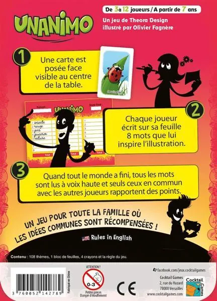Ce jeu intergénérationnel est basé sur un principe proche du baccalauréat. Au début de chaque manche, les joueurs posent une carte au milieu de la table. Puis chaque joueur inscrit sur son bloc huit mots que lui inspire l’illustration. Laissez-vous guider par votre imagination. Mais attention à ne pas faire trop original car les mots rapportent un nombre de points équivalent au nombre de joueurs les ayant cités. Ainsi, un mot cité par trois joueurs rapporte trois points à ceux qui l’ont trouvé.