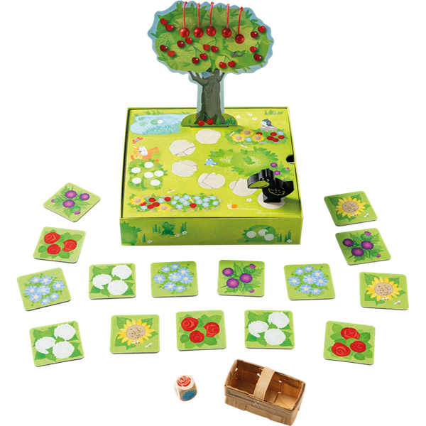 L’élégant cerisier en 3D croule sous les fruits délicieux, que les joueurs doivent cueillir avant que l’effronté corbeau n’arrive pour voler les fruits. Le dé de couleur captivant indique si l’on peut mettre des cerises dans le panier à fruits ou si le corbeau approche.