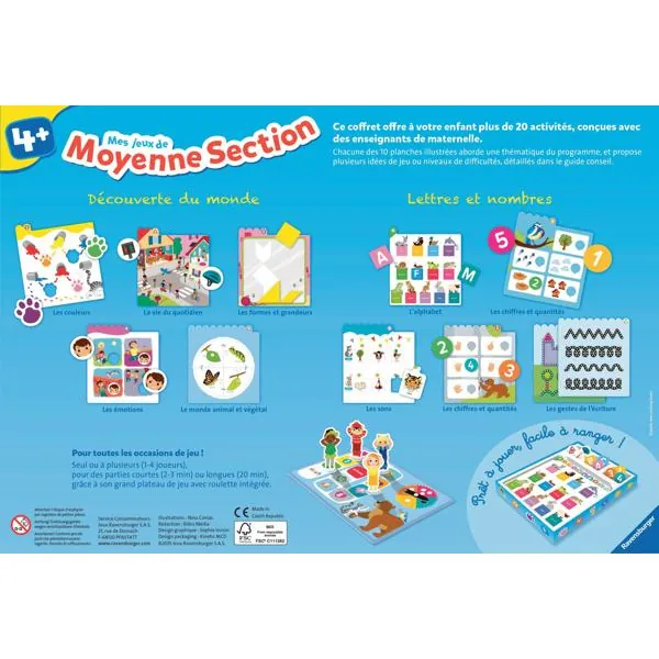 Contient: 1 plateau de jeu avec roulette intégrée, 4 figurines avec socles en plastique, 9 planches activités numérotées, 2 pochoirs à points, 54 jetons lettres, 20 jetons nombres, 8 jetons hygiène et sécurité, 7 pièces de tangram, 1 notice.