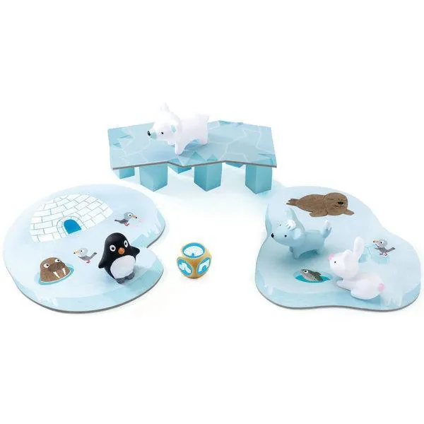Contient : 3 plateaux de jeu (1 plateau de départ "pêche", 1 pont de glace, 1 plateau d’arrivée "igloo"), 1 pont, 6 piliers en bois, 4 animaux en plastique, 1 dé et la règle de jeu.