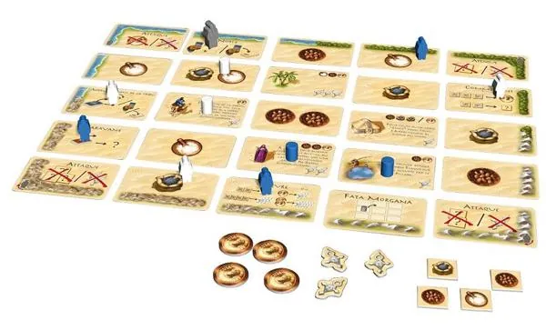 Vous voici le chef d’une tribu touareg. En tant que tel, chaque joueur doit faire du commerce de denrées situées à proximité comme les dattes et le sel, ou plus éloignées comme le poivre, dans le but de gagner de l’or et d’autres avantages. Il vous faut aussi agrandir votre famille. Carte après carte, de nouvelles offres se font à vous et obtenez les avantages que vous convoitez.