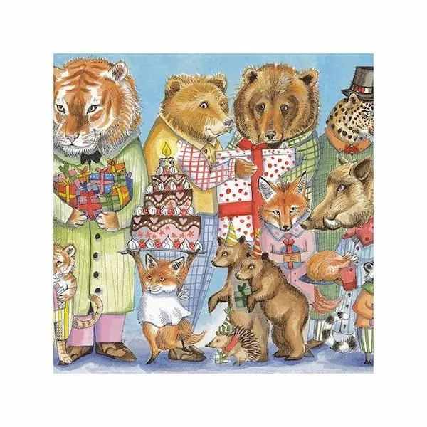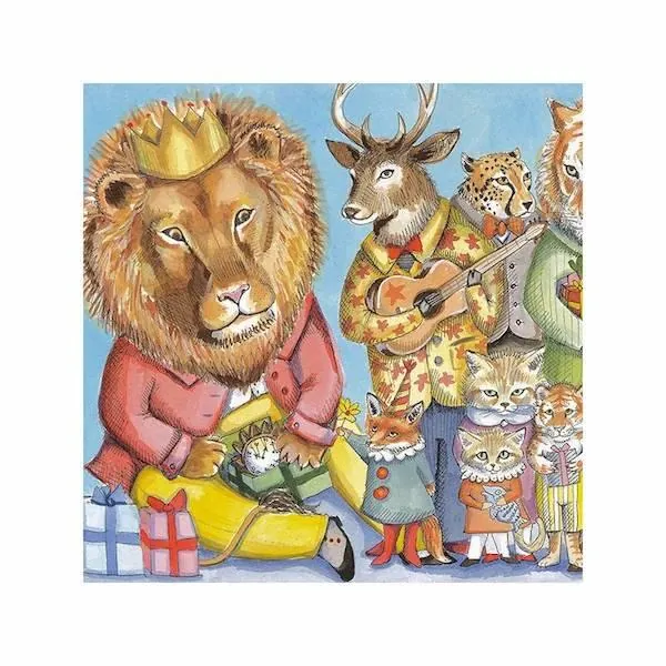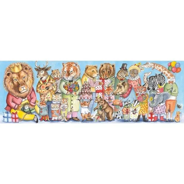 Le puzzle King Party panoramique de presque 1 mètres vous fera découvrir une scène haute en couleur: l'anniversaire du Lion, entourée de tous ses amis venus les bras chargés de cadeaux, de fleurs, de ballons !