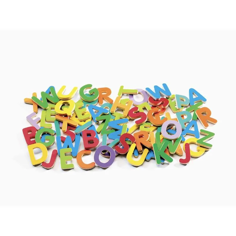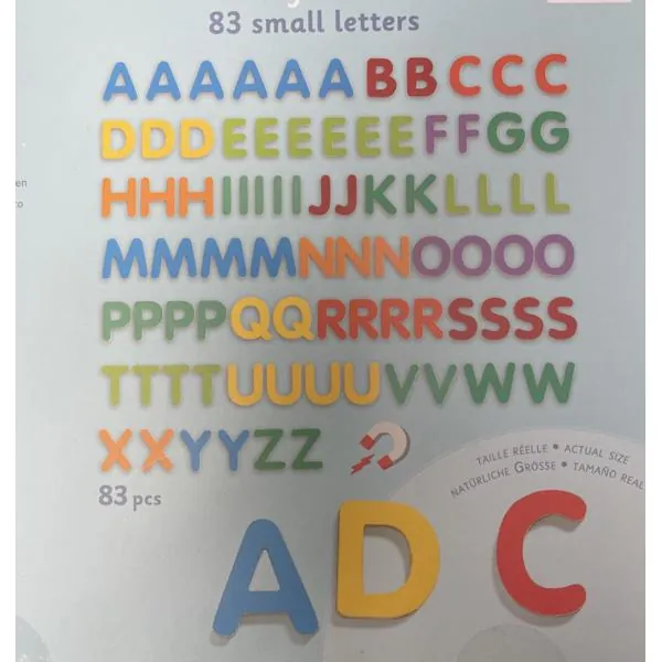 83 lettres majuscules, magnétiques en bois de 3 cm de hauteur.