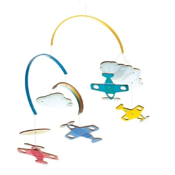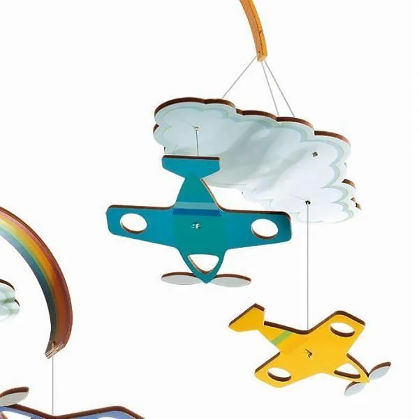 un mobile en bois avec des avions colorés au milieu des nuages et des arc-en-ciel.Ce mobile sera parfait pour décorer la chambre des bébés.