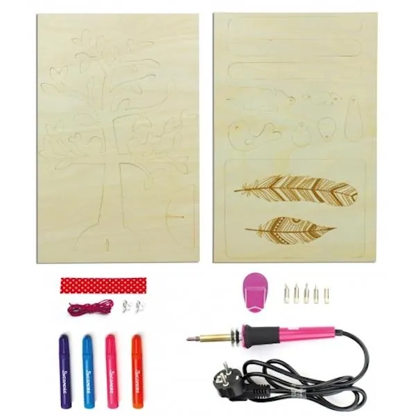 Contient : 1 pyrograveur, 5 embouts interchangeables, 1 arbre à bijoux en bois (38 x 23 cm), 1 barrette en bois, 1 bracelet en bois, 1 paire de boucle d’oreilles en bois, 4 pendentifs "best friends" en bois, 1 planche en bois (24 x 21 cm), 4 mètres de fil turquoise, 4 feutres (bleu, vert, violet, orange), 1 rouleau de masking tape, 1 livret d’instructions.