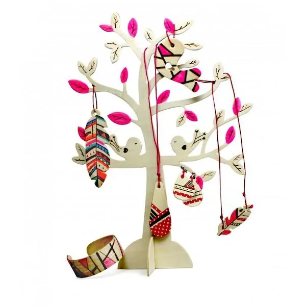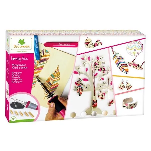 Un coffret complet pour créer autour de la pyrogravure. Tout le nécessaire pour customiser un arbre à bijoux, 7 bijoux en bois et un joli tableau.