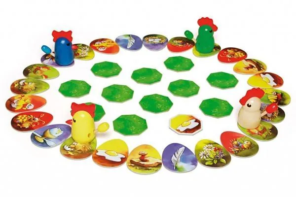 Case après case, 4 poules en bois cherchent leur chemin en retournant, au centre du parcours, la carte cachée correspondant à la case suivante. C'est une course folle, car chacun essaye de rattraper les volatiles adverses pour les déplumer ! La première poule ou le premier coq qui réussit à plumer tous les autres a gagné.