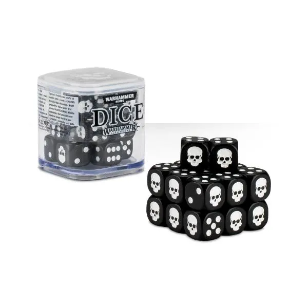 Un robuste cube en plastique contenant 20 dés couleur de 12mm avec une icône de crâne à la place du 1.