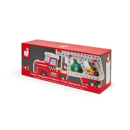 Ce joli camion en bois peut transporter jusqu'à quatre voitures Story Racing. Sa remorque peut accueillir 2 voitures sur chaque niveau. Très facile à manipuler : il suffit de tirer sur les poignées rouges pour que la rampe glisse vers l'arrière du camion et permette d'ouvrir la porte.
