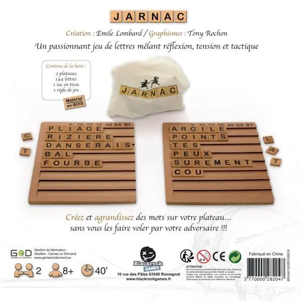 Jarnac est un duel de mots où chaque joueur devra constituer des mots de plus en plus longs afin de marquer un maximum de points, tout en évitant de s’en faire voler par son adversaire.
