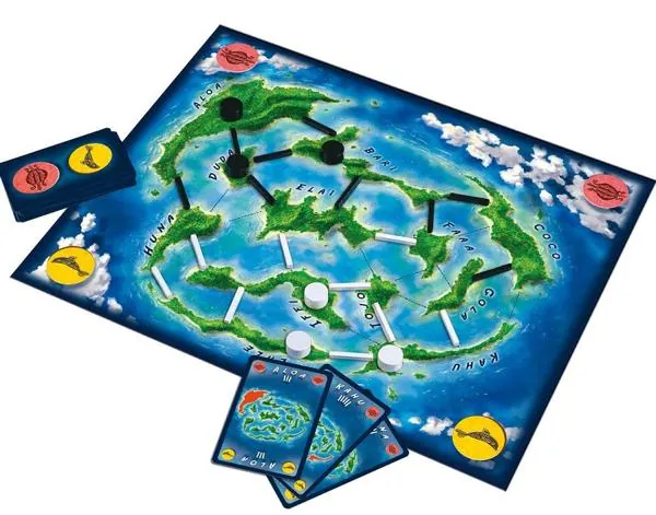 deux joueurs établissent des liaisons entre les îles. Celui qui détient suffisamment de liaisons sur une île peut, en signe de son pouvoir, la marquer d’une de ses pierres Kahuna.