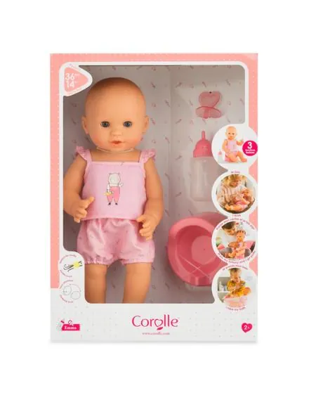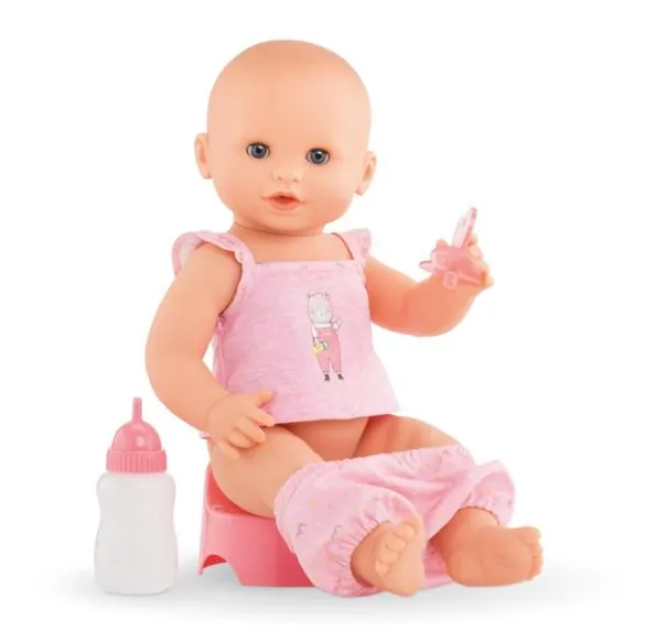 Ce grand poupon Corolle sexué fille boit son biberon qui se remplit d’eau et fait pipi sur son pot lorsqu’on lui appuie sur le ventre.