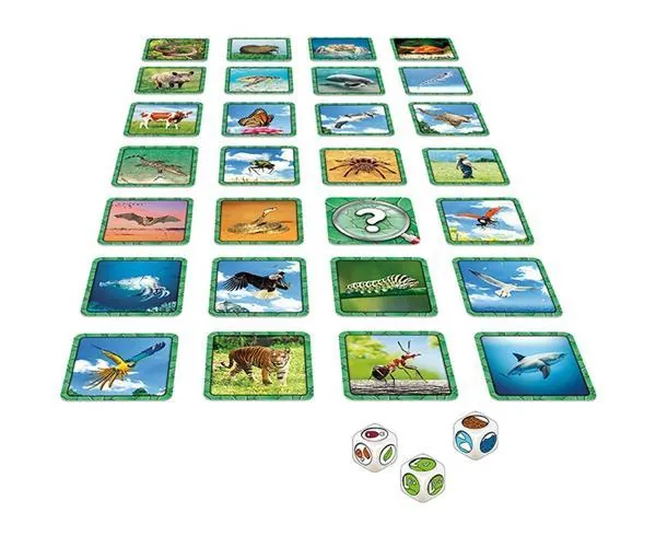 Lancez les dés et soyez le premier à désigner l’animal qui recoupe les trois caractéristiques annoncées : environnement, alimentation et nombre de pattes.