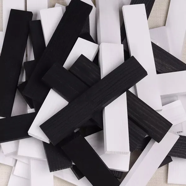 50 planchettes noires et 50 planchettes blanches dans un coffret en bois.