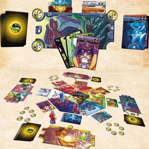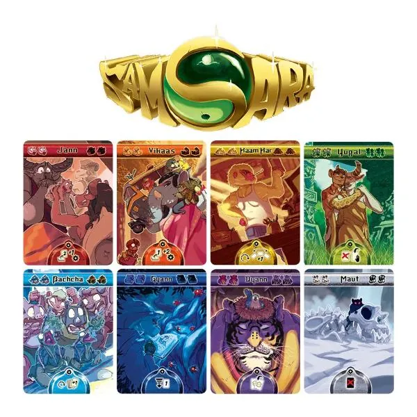 Concrètement, Samsara utilise le principe du deck-building, couplé à un système de déplacement de pion. À chaque tour, vous récupérez une carte action, que vous ajoutez à votre main. Ces cartes servent à la fois à jouer des actions (piocher, récupérer d’autres cartes, etc), et à acheter les Amulettes d’Éternité, qui constituent le but du jeu. Certaines actions permettent également de récupérer des cartes bon karma : elles servent de joker pour les achats des Amulettes d’Éternité.