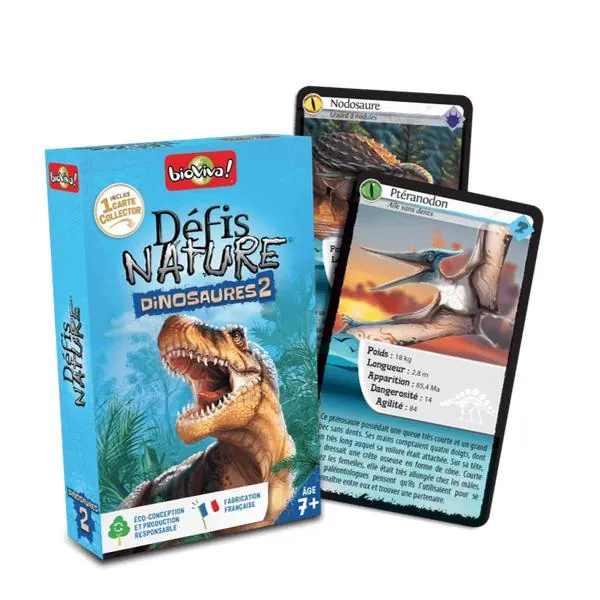 Défis Nature - Dinosaures 2 vous emmène à la rencontre des dinosaures les plus surprenants ! Découvrez les espèces disparues, puis pariez sur les points forts de vos animaux pour collecter toutes les cartes du jeu et remporter la partie. Alors, prêts à relever le défi ?
