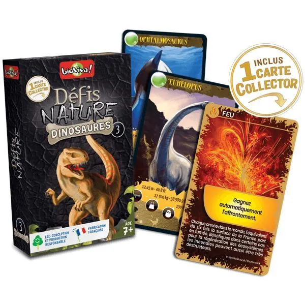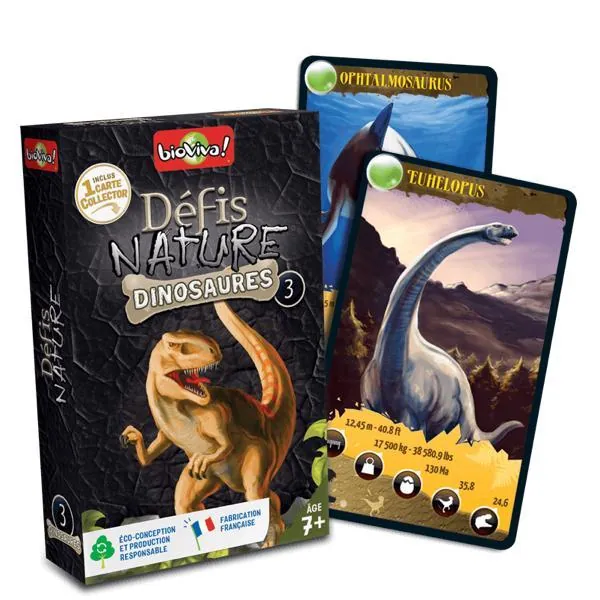 Défis Nature - Dinosaures 3 vous emmène à la rencontre des dinosaures les plus surprenants ! Découvrez les espèces disparues, puis pariez sur les points forts de vos animaux pour collecter toutes les cartes du jeu et remporter la partie. Alors, prêts à relever le défi ?