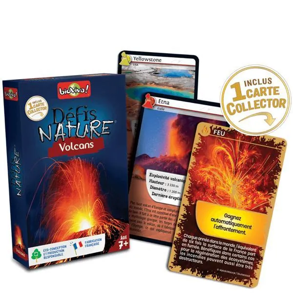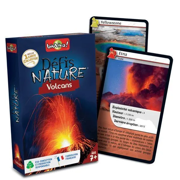 Défis Nature - Volcans vous emmène à la rencontre des volcans les plus surprenants de notre planète ! Pariez sur les points forts de vos volcans pour collecter toutes les cartes du jeu et remporter la partie. Alors, prêts à relever le défi ?