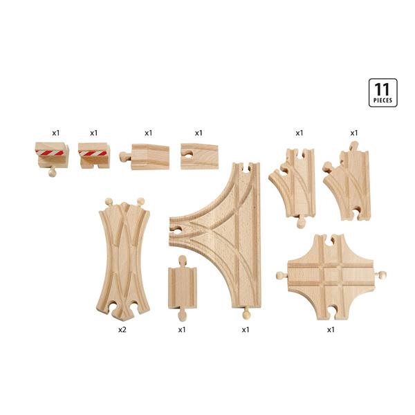 Le coffret comprend : un aiguillage T et deux aiguillages en X. Il contient aussi 2 aiguillages courbes, un aiguillage en croix, un petit rail, 2 rampes, 2 butoirs... Vous disposez là de tous les types de rails pour construire un réseau ferroviaire complet.