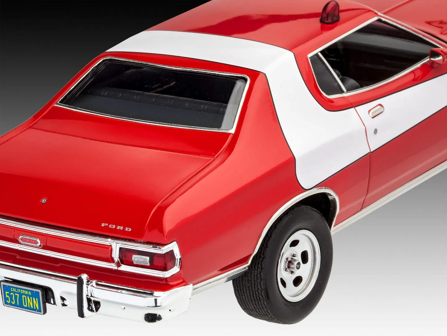 Modèle à assembler de cette grosse voiture de classe moyenne supérieure. La Torino gagna une réputation mondiale grâce à une série criminelle US ("Starsky et Hutch") sur les écrans de TV après 1975.