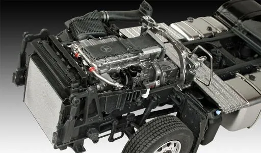 Boîte de construction complexe pour un transporteur routier apparu sur le marché en 2011. Les moteurs 6 cylindres de cet Actros de nouvelle génération offraient un puissance supérieure avec une consommation moindre que leurs prédécesseurs