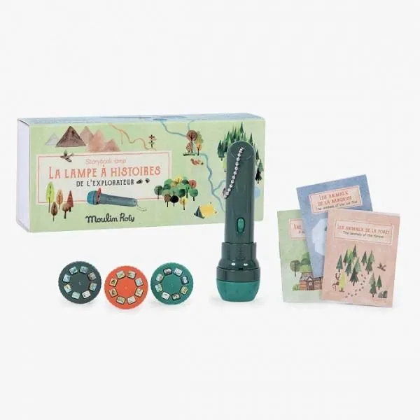 Lampe à histoires à projeter au mur grâce à ses trois disques comprenant 8 images aux illustrations poétiques.