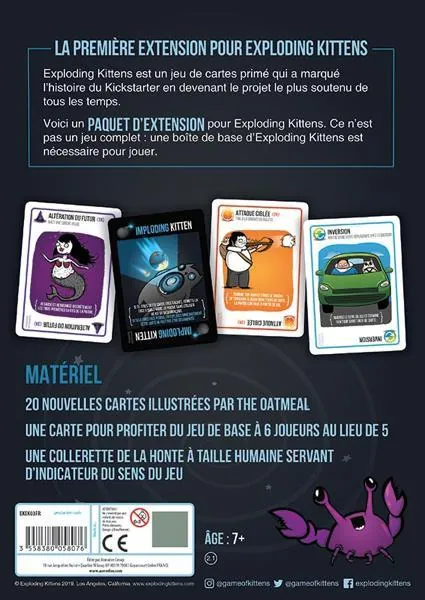 Imploding Kittens c’est toujours de l’humour, des chats explosifs et des parties rapides, funs et déjantées. C’est surtout 20 nouvelles cartes, une carte pour profiter du jeu de base à 6 joueurs au lieu de 5 et une collerette de la honte à taille humaine servant d’indicateur du sens du jeu !