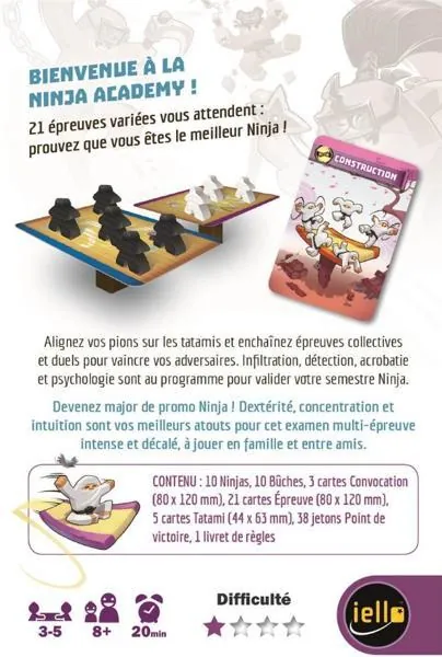 Ninja Academy est un jeu multi-épreuves pour 3 à 5 joueurs qui sollicite réflexes, intuition, précision et concentration sur fond d’humour totalement déjanté.