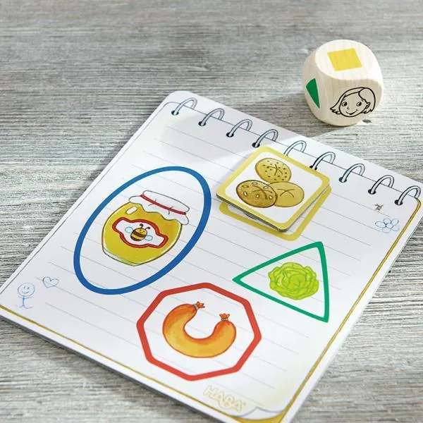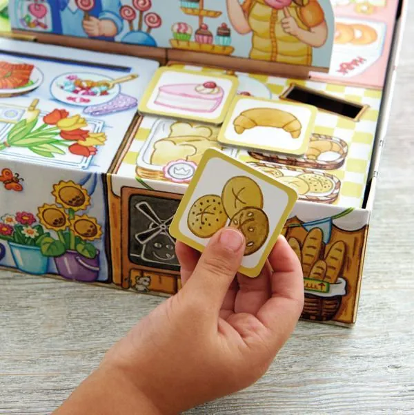 Chacun a une liste de courses avec quatre choses à acheter. Mais où trouve-t-on du pain et sur quel étal vend-on du fromage ? Combien coûtent les chaussettes et reste-t-il encore de délicieuses fraises ? Que peut-on acheter avec le billet ? Le dé détermine sur quel étal il faut faire les courses. Les enfants peuvent aussi jouer librement avec le matériel de jeu et s’essayer à de nombreux jeux de rôle de marchande.