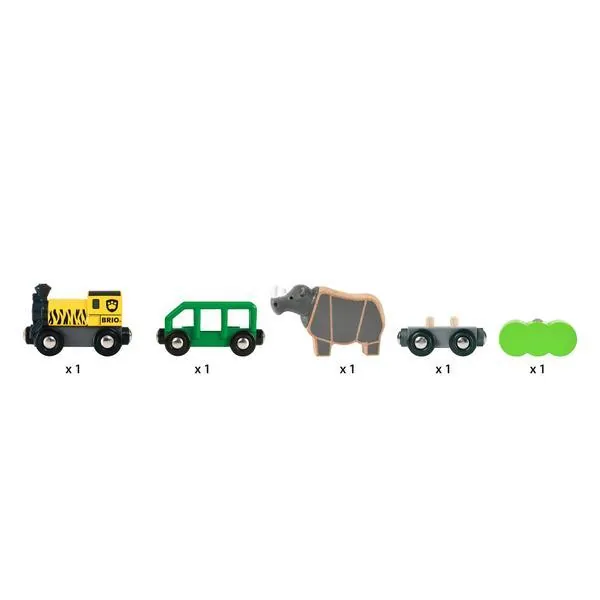 Le train Rhino Safari comprend une locomotive à vapeur en bois manuelle dotée d'aimants et ornée de détails en plastique ainsi que deux wagons à connecter à la locomotive : un wagon de transport vert pour le transport des animaux et un wagon de chargement plein de foin. En avant !