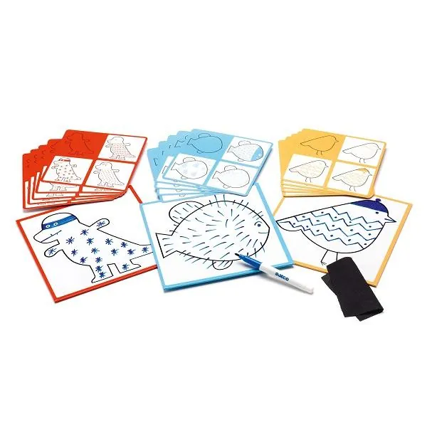 Contenu : 3 planches veleda, 1 feutre effaçable à sec, 1 chiffon, 30 modèles (15 cartes recto /verso)