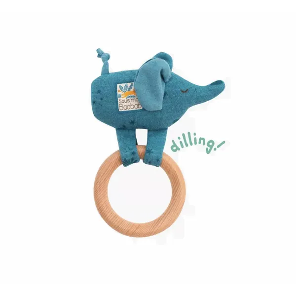 Ce bel anneau en bois est composé d'un éléphant en tissu molleton imprimé bleu.