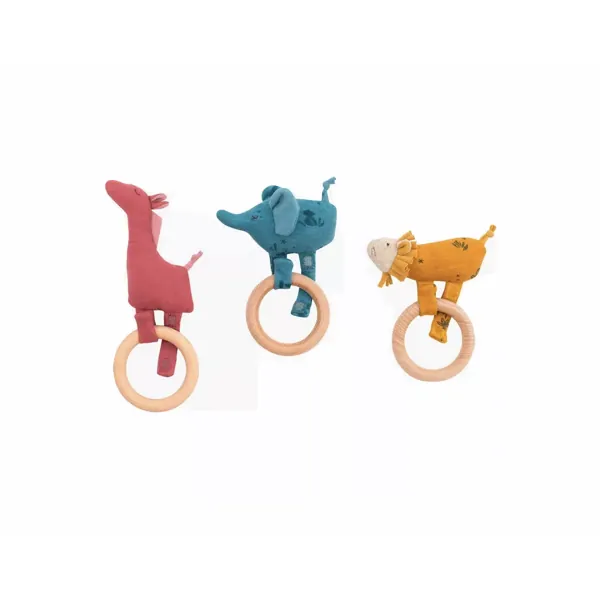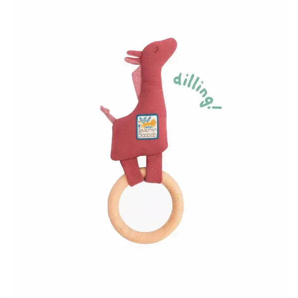 Ce bel anneau en bois est composé d'une girafe en tissu molleton imprimé rose.