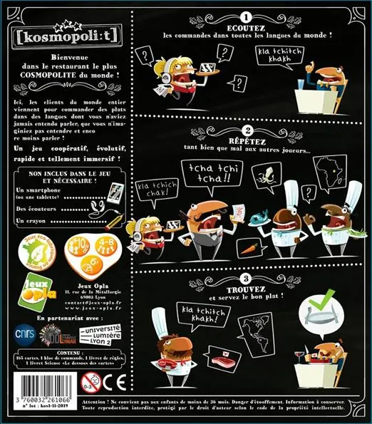 [kosmopoliːt] se joue de 4 à 8 joueurs parmi lesquels il y a toujours une Serveuse, un Maître d’Hôtel et des Cuistots. La Serveuse gèrera la salle de restaurant sur l’appli. elle aura ses écouteurs sur les oreilles et pourra prendre les commandes des clients qu’elle transmettra aux Cuistots et surtout au Maître d’Hôtel. Sauf que nos clients viennent du monde entier, et souhaitent déguster des plats typiques qu’ils demandent dans l’une de leurs 60 langues natives !