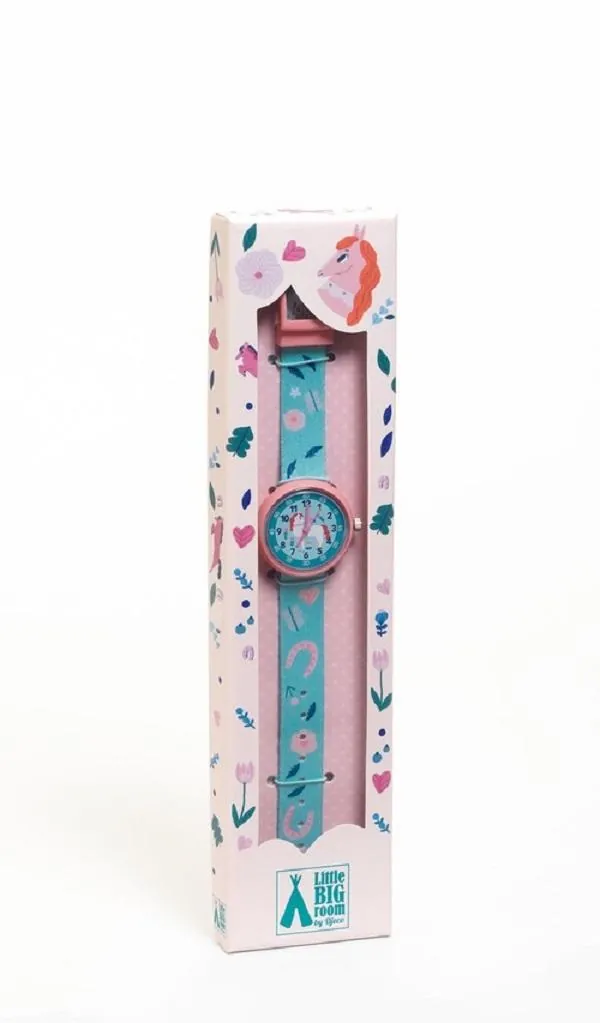 Une montre à quartz élégante et joliment illustrée sur le thème du cheval pour apprendre à lire l’heure. Une montre pédagogique avec deux cadrans bien distincts (un pour les heures, l’autre pour les minutes) et des aiguilles fines pour faciliter la lecture de l’heure.