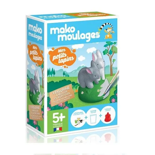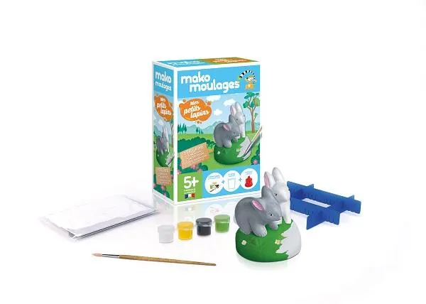 Contenu : 1 moule en latex (2 petits lapins), 1 sachet de 80g de plâtre, 4 pots de peinture 2,5 ml : vert, blanc, noir, jaune, 4 croisillons, 1 pinceau, 1 notice de jeu.