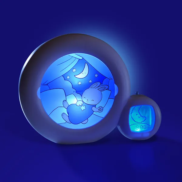 La figurine est illuminée en position de sommeil avec la lune, c’est encore l’heure de dormir. A l’heure réglée par les parents, le soleil se lève et la figurine passe en position réveillée, l’enfant sait qu’il peut se lever !