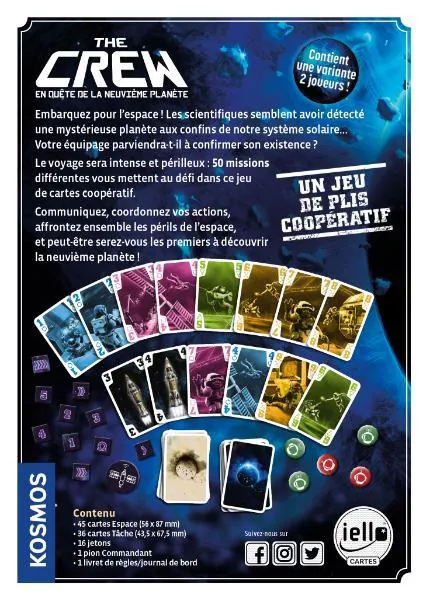 Dans The Crew, les joueurs incarnent les membres d’un équipage spatial en voyage vers une mystérieuse planète. Mais le périple s’annonce épique, car il faudra accomplir 50 missions de plus en plus périlleuses avant de pouvoir atteindre la destination. Pour remporter une mission dans The Crew, chaque joueur doit accomplir les tâches qui lui sont assignées.  A chaque tour de jeu, les joueurs jouent une unique carte de leur main pour former un pli. Le joueur qui veut accomplir sa tâche doit non seulement remporter le pli, mais aussi s’assurer que la carte correspondant à la tâche soit présente dans le pli !